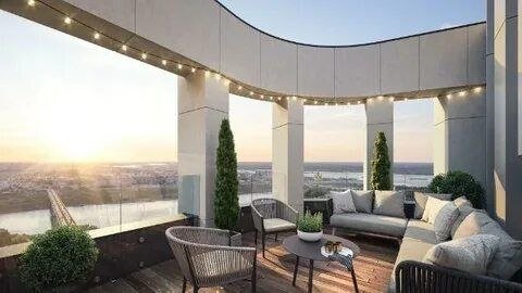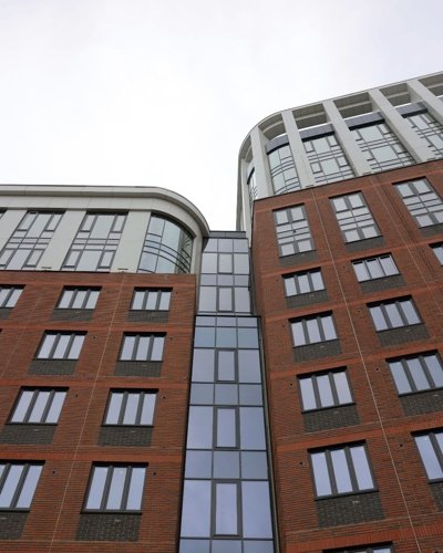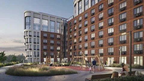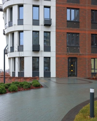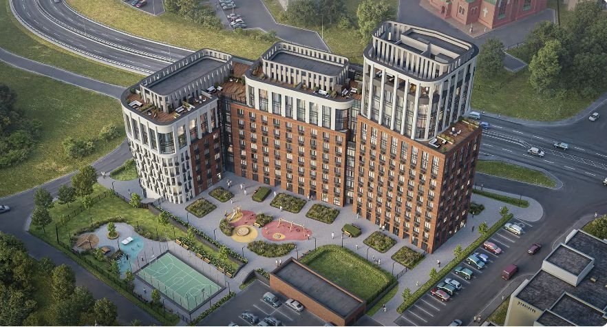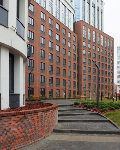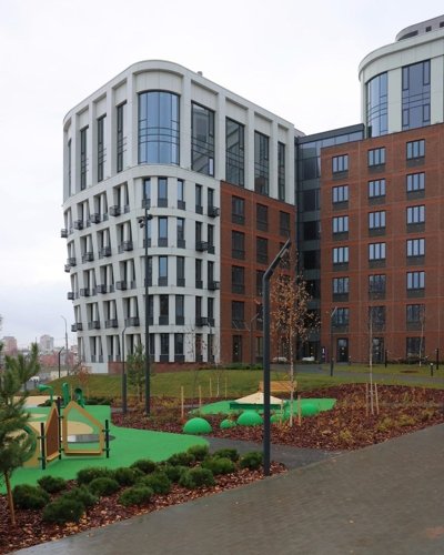Сложная конструктивная форма дома в виде чаши придает ему незабываемые очертания. Разноэтаэжные секции, витражное остекление, многообразие текстурных отделочных материалов – все это делает КМ Дом на Барминской таким невероятным.